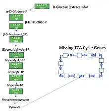 Metabolic pathway map depicting the enzymes of glycolysis in Mycoplasma pneumoniae.Green boxes signify enzymes that are present in the pathway. The white boxes symbolize missing enzymes. Enzymes of the TCA cycle are missing in M. pneumoniae. The complete pathway can be found at KEGG.[30]