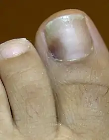 A nail disease or onychosis is a disease or deformity of the nail. Although the nail is a structure produced by the skin and is a skin appendage, nail diseases have a distinct classification as they have their own signs and symptoms which may relate to other medical conditions. Some nail conditions that show signs of infection or inflammation may require medical assistance.