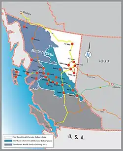 Northern Health is the publicly funded healthcare provider for the northern half of the Canadian province of British Columbia. Northern Health serves over 300,000 people in an area of 600,000 square kilometres.[1] It was established as one of five geographically based health authorities in 2001 by the Government of British Columbia.[2]