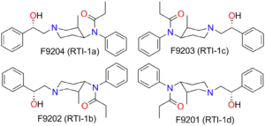 - ↑ Brine GA, Stark PA, Liu Y, Carroll FI, Singh P, Xu H, Rothman RB (April 1995). "Enantiomers of diastereomeric cis-N-[1-(2-hydroxy-2-phenylethyl)- 3-methyl-4-piperidyl]-N-phenylpropanamides: synthesis, X-ray analysis, and biological activities". Journal of Medicinal Chemistry. 38 (9): 1547–1557. doi:10.1021/jm00009a015. PMID 7739013.