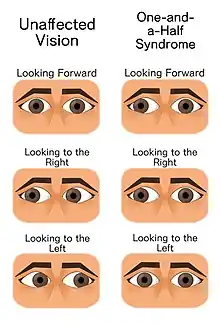 The one and a half syndrome is a rare weakness in eye movement affecting both eyes, in which one cannot move laterally at all, and the other can move only in outward direction. More formally, it is characterized by "a conjugate horizontal gaze palsy in one direction and an internuclear ophthalmoplegia in the other".[1][2] Nystagmus is also present when the eye on the opposite side of the lesion is abducted. Convergence is classically spared as cranial nerve III (oculomotor nerve) and its nucleus is spared bilaterally.