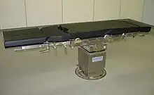 An operating table, sometimes called operating room table, is the table on which the patient lies during a surgical operation.[1] This surgical equipment is usually found inside the surgery room of a hospital.[2] A specialized type of operating table, called a surgical fracture table (or trauma table), is designed to allow an orthopedic surgeon to perform common orthopedic procedures such as hip fractures, pelvic fractures, tibial fractures, fibula fractures, and anterior approach total hip arthroplasty.[3] Modern surgical fracture tables cost >US$200,000, but the costs can be reduced to make them more accessible using distributed digital fabrication with 3D printing of open-source hardware designs.[4]