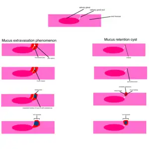 Mucous extravasation phenomenon is a swelling of connective tissue consisting of a collection of fluid called mucus. This occurs because of a ruptured salivary gland duct usually caused by local trauma (damage) in the case of mucous extravasation phenomenon and an obstructed or ruptured salivary duct in the case of a mucus retention cyst. The mucocele has a bluish, translucent color, and is more commonly found in children and young adults.