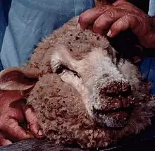It has been recorded since the late 19th century and has been reported from most sheep-or goat-raising areas, including those in Europe, the Middle East, the United States, Africa, Asia, South America, Canada, New Zealand and Australia.[7] Orf is spread by fomites and direct contact. In some environments, infection is injected by scratches from thistles[1] of both growing and felled plants. Symptoms include papules and pustules on the lips and muzzle, and less commonly in the mouth of young lambs and on the eyelids, feet, and teats of ewes. The lesions progress to thick crusts which may bleed. Orf in the mouths of lambs may prevent suckling and cause weight loss, and can infect the udder of the mother ewe, thus potentially leading to mastitis.[1] Sheep are prone to reinfection.[8] Occasionally the infection can be extensive and persistent if the animal does not produce an immune response.[1]