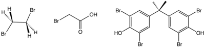 Structure of three industrially significant organobromine compounds. From left: ethylene bromide, bromoacetic acid, and tetrabromobisphenol-A.