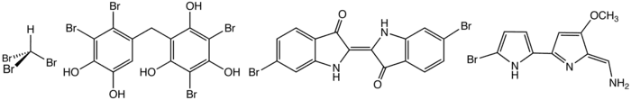 Structure of some naturally-occurring organobromine compounds. From left: bromoform, a brominated bisphenol, dibromoindigo (Tyrian purple), and the antifeedant tambjamine B.