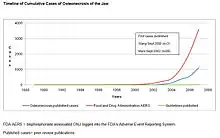 The first three reported cases of bisphosphonate-associated osteonecrosis of the jaw were spontaneously reported to the FDA by an oral surgeon in 2002, with the toxicity being described as a potentially late toxicity of chemotherapy.[12] In 2003 and 2004, three oral surgeons independently reported to the FDA information on 104 cancer patients with bisphosphonate-associated osteonecrosis of the jaw seen in their referral practices in California, Florida, and New York.[13][14][15] These case series were published as peer-reviewed articles – two in the Journal of Oral and Maxillofacial Surgery and one in the Journal of Clinical Oncology. Subsequently, numerous instances of persons with this adverse drug reaction were reported to the manufacturers and to the FDA. By December 2006, 3607 cases of people with this ADR had been reported to the FDA and 2227 cases had been reported to the manufacturer of intravenous bisphosphonates.