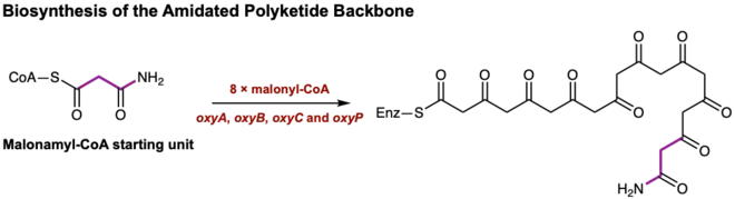 The biosynthesis of oxytetracycline begins with the utilization of PKS enzymes ketosynthase (KS), the chain length factor (CLF), the acyl carrier protein (ACP), and an acyltransferase (encoded as OxyA, OxyB, OxyC and OxyP in the oxytetracycline gene cluster)[7] to catalyze the extension of the malonamyl-CoA starting unit with eight malonyl-CoA extender units. The process of elongating the polypeptide skeleton occurs through a series of Claisen-like decarboxylation reactions until the linear tetracyclic skeleton is formed.[8] Thus, minimal PKSs form a completed amidated polyketide backbone without any additional post-synthase tailoring enzymes (Figure 1).