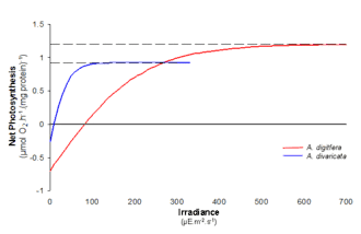As can be seen in the graph, two species can have different responses to the same incremental changes in light intensity. Population A (in blue) has an initial rate higher than that of Population B (in red) and also exhibits a stronger rate change to increased light intensities at lower irradiance. Therefore, Population A will dominate in an environment with lower light availability. Although Population B has a slower photosynthetic response to increases in light intensity its Pmax is higher than that of Population A. This allows for eventual population dominance at greater light intensities. There are many determining factors influencing population success; using the PI curve to elicit predictions of rate flux to environmental changes is useful for monitoring phytoplankton bloom dynamics and ecosystem stability.