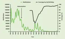 However, negative publicity and fearmongering caused the immunization rate to fall in several countries, including the UK, Sweden, and Japan. A dramatic increase in the incidence of pertussis followed.[40] For example, in England and Wales before the introduction of pertussis immunisation in the 1950s, the average annual number of notifications exceeded 120,000. By 1972, when vaccine coverage was around 80%, there were only 2,069 notifications of pertussis. The professional and public anxiety about the safety and efficacy of the whole-cell vaccine caused coverage to fall to about 60% in 1975 and around 30% by 1978. Major epidemics occurred in 1977–79 and 1981–83. In 1978 there were over 65,000 notifications and 12 deaths (see the chart of pertussis notifications). These two major epidemics illustrate the impact of a fall in coverage of an effective vaccine. The actual number of deaths due to these pertussis outbreaks was higher since not all cases in infants are recognised.[16]