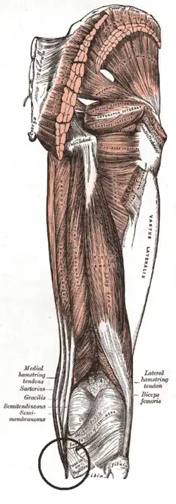 ![]() Muscles of the gluteal and posterior femoral regions. Area of pes anserinus is encircled at bottom. Sartorius, gracilis, semitendinosus and semimembranosus are labeled at bottom left. | |