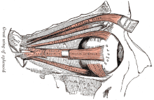 | Anatomy of the eye. The external eye muscles are shown in red. | |