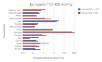 The transformation of estradiol into estrone and estrogen conjugates is reversible.[10] As such, these metabolites can be converted back into estradiol.[10] About 15% of orally administered estradiol is transformed into estrone and 65% into estrone sulfate.[12] About 5% of estrone and 1.4% of estrone sulfate is converted back into estradiol.[12] An additional 21% of estrone sulfate is converted into estrone, whereas transformation of estrone into estrone sulfate is approximately 54%.[12] The interconversion between estradiol and estrone is mediated by 17β-hydroxysteroid dehydrogenases (17β-HSDs),[12] whereas the conversion of estrone into estrone sulfate is mediated by estrogen sulfotransferases (ESTs) and the transformation of estrone sulfate into estrone by steroid sulfatase (STS).[98][99] The metabolic clearance rates and hence blood half-lives of estrogen conjugates like estrone sulfate are much longer than those of estradiol and estrone.[10][12][91] Estrogen conjugates, primarily estrone sulfate, serve as a large circulating reservoir for estradiol, and because of this, they function to greatly extend the biological half-life of oral estradiol.[10][12] As such, the biological half-life of oral estradiol is a composite parameter that is dependent on interconversion between estradiol and estrogen conjugates, as well as on enterohepatic recirculation.[12] Whereas the biological half-life of estradiol given by intravenous injection is about 0.5 to 2 hours, the biological half-life of oral estradiol has a range of 13 to 20 hours due to the large and long-lasting pool of estrogen conjugates that is formed during first-pass metabolism and that serves to continuously replenish circulating estradiol levels.[12][10][9]