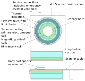 Most superconducting magnets have their coils of superconductive wire immersed in liquid helium, inside a vessel called a cryostat. Despite thermal insulation, sometimes including a second cryostat containing liquid nitrogen, ambient heat causes the helium to slowly boil off. Such magnets, therefore, require regular topping-up with liquid helium. Generally a cryocooler, also known as a coldhead, is used to recondense some helium vapor back into the liquid helium bath. Several manufacturers now offer 'cryogenless' scanners, where instead of being immersed in liquid helium the magnet wire is cooled directly by a cryocooler.[44] Alternatively, the magnet may be cooled by carefully placing liquid helium in strategic spots, dramatically reducing the amount of liquid helium used,[45] or, high temperature superconductors may be used instead.[46][47]