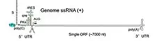 Picornaviruses are classed under Baltimore's viral classification system as group IV viruses, as they contain a single-stranded, positive-sense RNA genome. Their genome ranges between 6.7 and 10.1 (kilobases) in length.[7] Like most positive-sense RNA genomes, the genetic material alone is infectious; although substantially less virulent than if contained within the viral particle, the RNA can have increased infectivity when transfected into cells. The genome RNA is unusual because it has a protein on the 5' end that is used as a primer for transcription by RNA polymerase. This primer is called VPg genome, and it ranges between 2 and 3 kb. VPg contain tyrosine residue at the 3' end. Tyrosine as a –OH source for covalently linked to 5' end of RNA.[9][11]