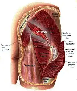 ![]() Buttocks seen from behind (the piriformis and the rest of the lateral rotator group are visible) | |