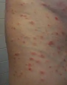 | Photo of the Pityriasis lichenoides et varioliformis acuta or Mucha Habermann's Disease, showing the right leg | |