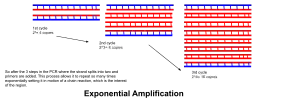 - Exponential amplification: At every cycle, the amount of product is doubled (assuming 100% reaction efficiency). After 30 cycles, a single copy of DNA can be increased up to 1,000,000,000 (one billion) copies. In a sense, then, the replication of a discrete strand of DNA is being manipulated in a tube under controlled conditions.[16] The reaction is very sensitive: only minute quantities of DNA must be present.