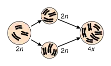 Polyploidy is the result of whole-genome duplication during the evolution of species. It may occur due to abnormal cell division, either during mitosis, or more commonly from the failure of chromosomes to separate during meiosis or from the fertilization of an egg by more than one sperm.[1] In addition, it can be induced in plants and cell cultures by some chemicals: the best known is colchicine, which can result in chromosome doubling, though its use may have other less obvious consequences as well. Oryzalin will also double the existing chromosome content.