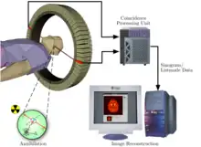 PET is a common imaging technique, a medical scintillography technique used in nuclear medicine. A radiopharmaceutical – a radioisotope attached to a drug – is injected into the body as a tracer. When the radiopharmaceutical undergoes beta plus decay, a positron is emitted, and when the positron interacts with an ordinary electron, the two particles annihilate and two gamma rays are emitted in opposite directions.[2] These gamma rays are detected by two gamma cameras to form a three-dimensional image.