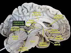 ![]() Sagittal cross-section of the human brain. The posterior commissure is labelled at center top. | |