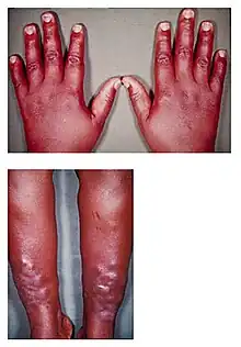 - ↑ Dennis, Mark; Bowen, William Talbot; Cho, Lucy (2012). "Pre-tibial myxoedema (thyroid dermopathy)". Mechanisms of Clinical Signs. Elsevier. p. 550. ISBN 978-0729540759; pbk