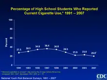 In November 2015, a Centers for Disease Control and Prevention (CDC) report noted that "the percentage of U.S. adults who smoke cigarettes had already declined from 20.9 percent in 2005 to 16.8 percent in 2014. Cigarette smoking was significantly lower in 2014 (16.8 percent) than in 2013 (17.8 percent)." The CDC concluded this from data obtained by a survey of Americans. In 2017, researchers reported that they were unsure if products like e-cigarettes were in any way helpful to reducing smoking in the country. They added that some 4,000 minors in the U.S. start smoking every day.[55]