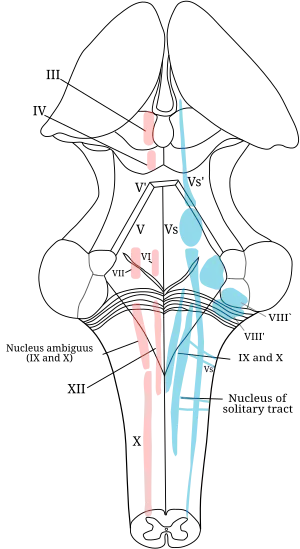 ![]() The cranial nerve nuclei schematically represented; dorsal view. Motor nuclei in red; sensory in blue. (Trigeminal nerve nuclei are at "V".) | |