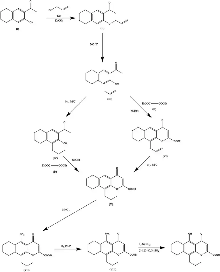 The condensation of 6-acetyl-7-hydroxy-1,2,3,4-tetrahydronaphthalene (I) with allyl bromide (A) using of K2CO3 in DMF gives 6-acetyl-7-allyloxy-1,2,3,4-tetrahydronaphthalene (II), which is isomerized to 5-allyl-7-acetyl-6-hydroxy-1,2,3,4-tetrahydronaphthalene (III) by warming at 200 °C. Reduction of (III) with H2 over Pd/C in ethanol results in 5-propyl-7-acetyl-6-hydroxy-1,2,3,4-tetrahydronaphthalene (IV), which is now cyclized using diethyl oxalate (B) using sodium ethoxide in refluxing ethanol to give ethyl 10-propyl-4-oxo-6,7,8,9-tetrahydro-4H-naphtho[2,3-b]pyran-2-carboxylate (V).