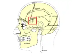 The pterion is known as the weakest part of the skull.[3] The anterior division of the middle meningeal artery runs underneath the pterion.[4] Consequently, a traumatic blow to the pterion may rupture the middle meningeal artery causing an epidural haematoma. The pterion may also be fractured indirectly by blows to the top or back of the head that place sufficient force on the skull to fracture the pterion.