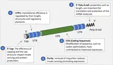 The in vitro transcribed mRNA has the same structural components as natural mRNA in eukaryotic cells. It has a 5' cap, a 5'-untranslated region (UTR) and 3'-UTR, an open reading frame (ORF), which encodes the relevant antigen, and a 3'-poly(A) tail. By modifying these different components of the synthetic mRNA, the stability and translational ability of the mRNA can be enhanced, and in turn, the efficacy of the vaccine improved.[57]