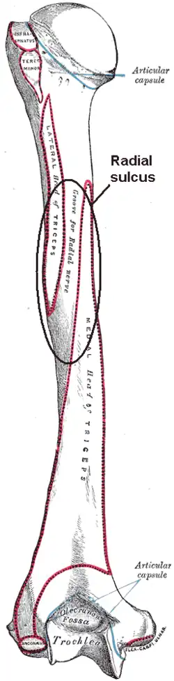 - 1 2 Sadan AY; Ibrahim TEKDEMIR; Ugur SAYLI; Alaittin ELHAN; K. Mine ERBIL; Ruhgun BASAR (October 1999). "Relation of the Radial Nerve with the Sulcus Nervi Radians: A Morphometric Study". Okajimas Folia Anatomica Japonica. 76 (4): 197–202. doi:10.2535/ofaj1936.76.4_197. PMID 10565203.