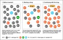 A resistance mutation is a mutation in a virus gene that allows the virus to become resistant to treatment with a particular antiviral drug. The term was first used in the management of HIV, the first virus in which genome sequencing was routinely used to look for drug resistance. At the time of infection, a virus will infect and begin to replicate within a preliminary cell. As subsequent cells are infected, random mutations will occur in the viral genome.[1] When these mutations begin to accumulate, antiviral methods will kill the wild type strain, but will not be able to kill one or many mutated forms of the original virus. At this point a resistance mutation has occurred because the new strain of virus is now resistant to the antiviral treatment that would have killed the original virus.[1] Resistance mutations are evident and widely studied in HIV due to its high rate of mutation and prevalence in the general population. Resistance mutation is now studied in bacteriology and parasitology.
