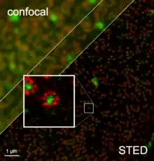 - 1 2 Müller, T.; Schumann, C.; Kraegeloh, A. (2012). "STED Microscopy and its Applications: New Insights into Cellular Processes on the Nanoscale". ChemPhysChem. 13 (8): 1986–2000. doi:10.1002/cphc.201100986. PMID 22374829.