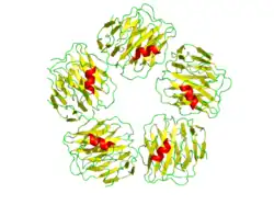 SAP is a member of the pentraxins family, characterised by calcium-dependent ligand binding and a distinctive flattened β-jellyroll structure similar to that of the legume lectins.[12] The name "pentraxin" is derived from the Greek words for five (penta) and berries (ragos), relating to the radial symmetry of five monomers forming a ring approximately 95 across and 35 deep. Human SAP has 51% sequence homology with C-reactive protein (CRP), a classical acute phase response plasma protein, and is a more distant relative to the "long" pentraxins such as PTX3 (a cytokine-modulated molecule) and several neuronal pentraxins. Both SAP and CRP are evolutionary conserved in all vertebrates and are also found in distant invertebrates such as the horseshoe crab (Limulus polyphemus).[13]