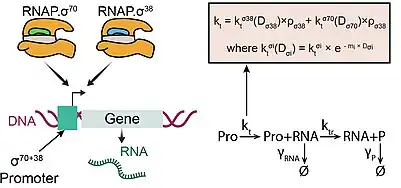While most genes of E. coli can be recognized by an RNAP with one and only one type of sigma factor (e.g. sigma 70), a few genes (~ 5%) have what is called a “dual sigma factor preference”,[15] that is, they can respond to two different sigma factors, as reported in RegulonDB.[16] The most common ones are those promoters that can respond to both sigma 70 and to sigma 38 (iIlustrated in the figure) . Studies of the dynamics of these genes showed that when the cells enter stationary growth they are almost as induced as those genes that have preference for σ38 alone. This induction level was shown to be predictable from their promoter sequence.[15] A model of their dynamics is shown in the figure. In the future, these promoters may become useful tools in synthetic genetic constructs in E. coli.