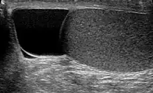 | Ultrasound of a testicle (grey) and a spermatocele (black). | |