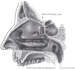 The sphenoethmoidal recess is a small triangular space superior to the superior nasal meatus of the nasal cavity into which the sphenoidal sinus[1][2][3] opens.[4] The sphenoethmoidal recess is situated superoposterior to the superior nasal concha,[3][2] between the superior nasal concha and the anterior aspect of the body of the sphenoid bone.[1]