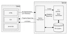 The server side (back-end) handles client requests via C, C++ and Python.[21] It interfaces to common open source libraries and software tools like the Insight Toolkit,[22] the Visualization Toolkit (VTK),[23] the X Toolkit (XTK)[24] and Slice:Drop.[25] The server communication is handled by AJAX requests[26] were needed.