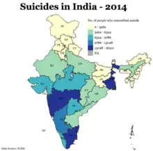- ↑ Patel, V.; Ramasundarahettige, C.; Vijayakumar, L.; Thakur, J. S.; Gajalakshmi, V.; Gururaj, G.; Suraweera, W.; Jha, P. (2012). "Suicide mortality in India: A nationally representative survey". The Lancet. 379 (9834): 2343–51. doi:10.1016/S0140-6736(12)60606-0. PMC 4247159. PMID 22726517.