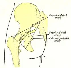 ![]() Left gluteal region, showing surface markings for arteries and sciatic nerve | |