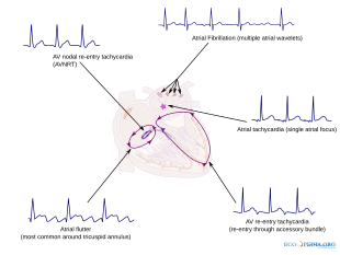| Types | Atrial fibrillation, atrial flutter, paroxysmal supraventricular tachycardia (PSVT), Wolff-Parkinson-White syndrome,[2] AVRT, AVNRT, PJRT, Sinus Tachycardia, MAT, JET, Atrial tachycardia, SA Nodal Reentrant Tachycardia (SANRT) |