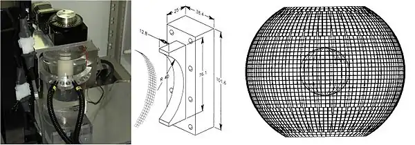 In order to capture sufficient thermoacoustic data to form an accurate 3D map of electromagnetic absorption, it is necessary to surround the anatomy being imaged with a 2D array of transducers. The world's first 3D thermoacoustic animal scanner (Fig. 8: left panel) accomplished this by combining a cylindrical array of 128 transducers (Fig. 8: center panel) with rotation of the animal being imaged about the vertical axis. The net result was to capture thermoacoustic data over the surface of a sphere surrounding the animal being imaged (Fig. 8: right panel).[21] This device was capable of visualizing structures as small as 1/3 millimeter. An animated 3D image of the vasculature in the head of a mouse is displayed in Fig. 9. This animated image was acquired using near infrared radiation at 800 nm, where optical absorption by blood is higher than surrounding tissues. Therefore, the vasculature is preferentially visualized.