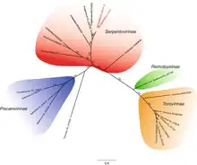 Tobaniviridae is a family of enveloped, positive-strand RNA viruses in the order Nidovirales which infect vertebrates.[1] The most common host organisms include mammals, fish, and snakes, with some infections observed in other reptiles.[2] The genome size of tobaniviruses ranges from 20 to 32 kilobases.[3] The family is the only member of the suborder Tornidovirineae.[4]
