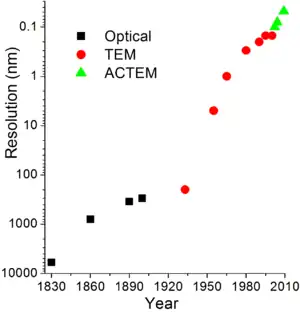 The first TEM was demonstrated by Max Knoll and Ernst Ruska in 1931, with this group developing the first TEM with resolution greater than that of light in 1933 and the first commercial TEM in 1939. In 1986, Ruska was awarded the Nobel Prize in physics for the development of transmission electron microscopy.[2]