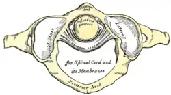 ![]() Membrana tectoria, transverse, and alar ligaments. (Transverse ligament visible at center.) | |