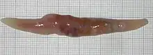 Trematodes are flattened oval or worm-like animals, usually no more than a few centimeters in length, although species as small as 1 millimetre (0.039 in) are known. Their most distinctive external feature is the presence of two suckers, one close to the mouth, and the other on the underside of the animal.[12]
