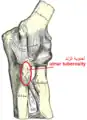 The tuberosity of the ulna is a rough eminence on the proximal end of the ulna. It occurs at the junction of the antero-inferior surface of the coronoid process with the front of the body. It provides an insertion point to a tendon of the brachialis[1][2] (the oblique cord of the brachialis is attached to the lateral border).
