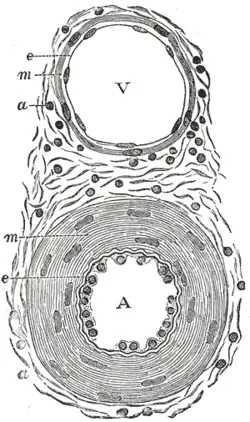 ![]() Transverse section through a small artery and vein of the mucous membrane of the epiglottis of a child. (Tunica intima is at "e".) | |