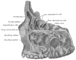 ![]() Specimen from a child eight years, eight months, and one day old. Lateral view of frontal, ethmoidal and maxillary sinus areas, the lateral portion of each having been removed by sagittal cuts. ("Maxillary septa" labeled at center left.) | |